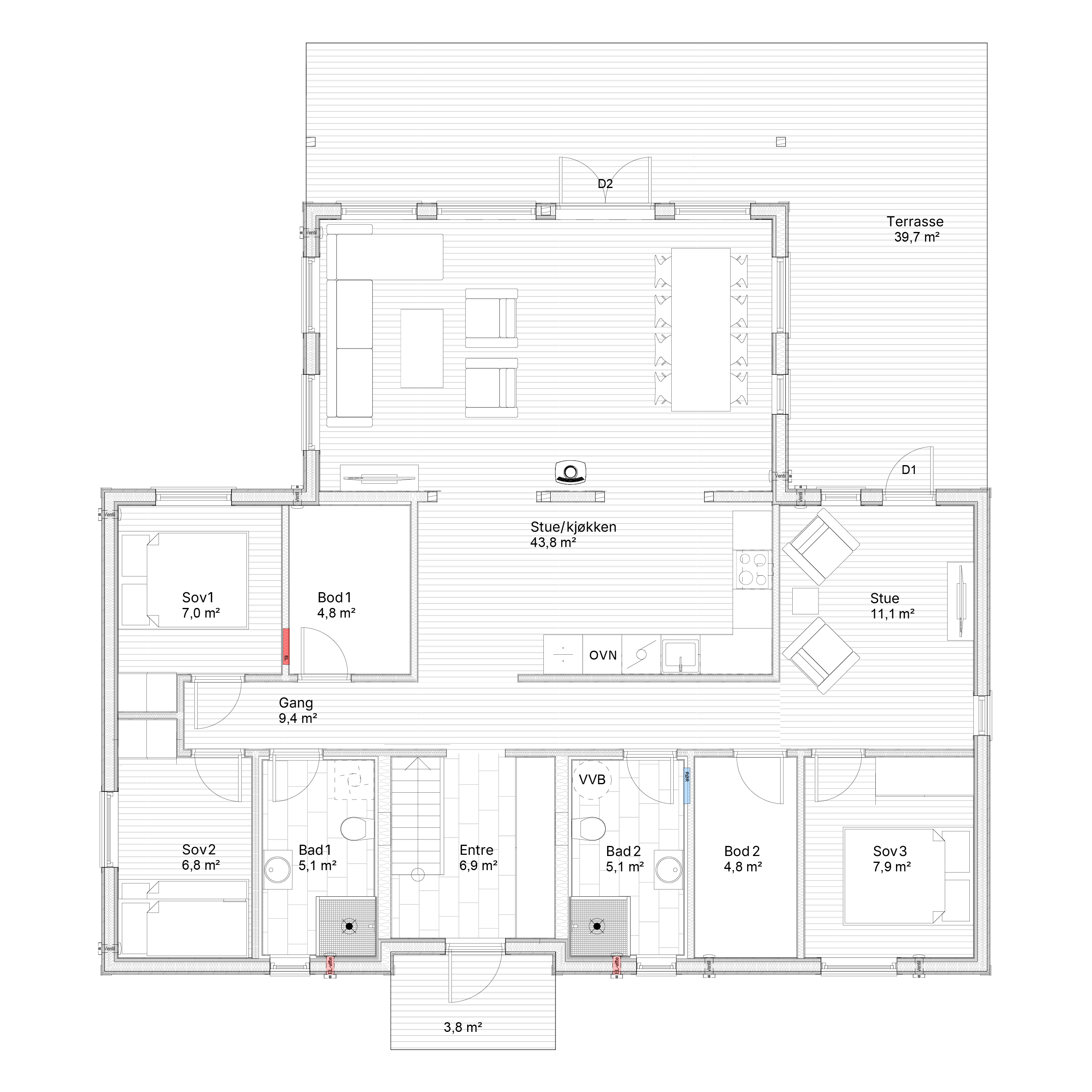 Med en separat stue i første etasje, som har direkte utgang til terrassen, får du et ekstra oppholdsrom hvor du kan trekke deg tilbake og nyte stillheten. Denne stuen kan enkelt avskjermes med en skyvedør eller gjøres om til et fjerde soverom etter behov.