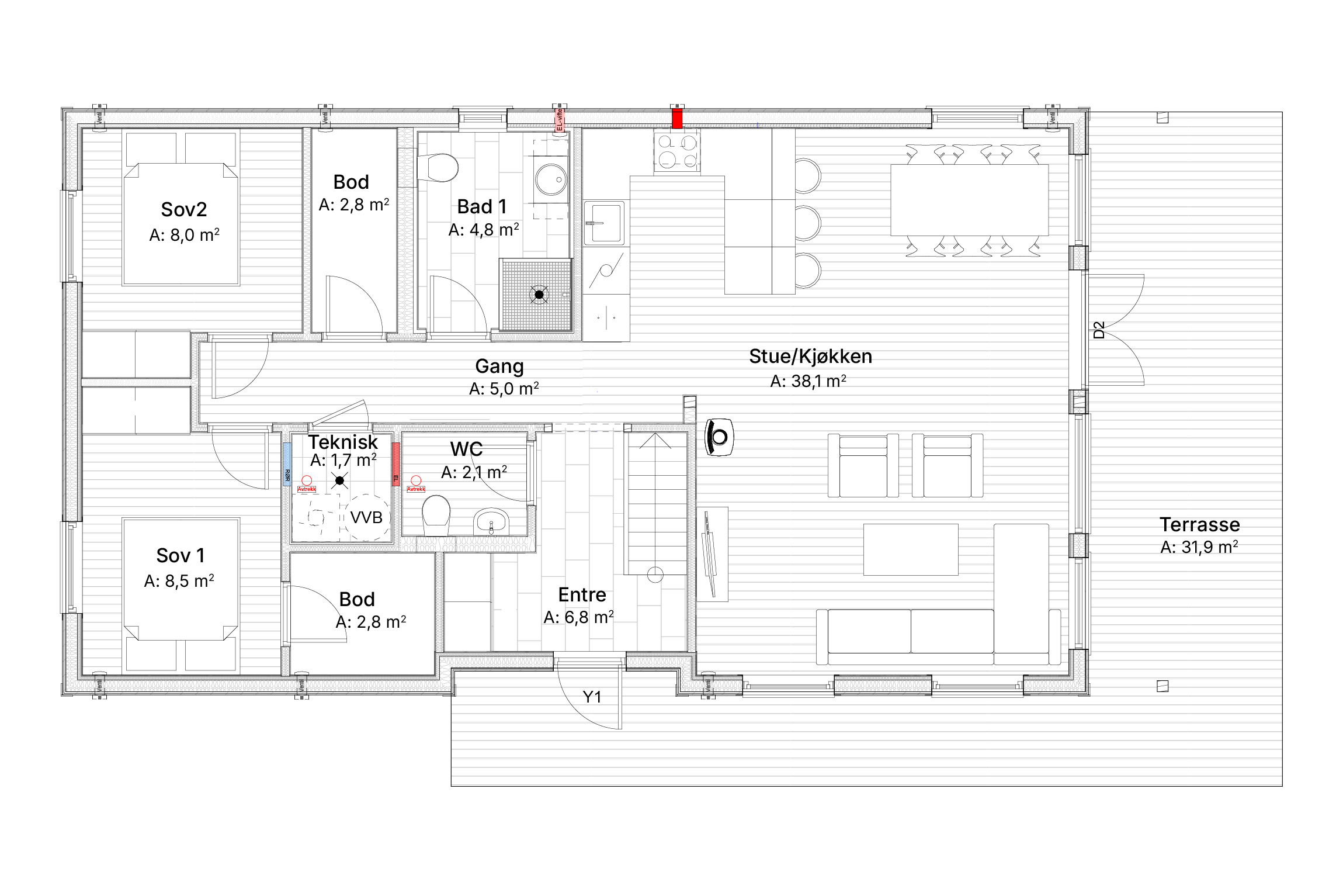 Kjøkkenøya fungerer som et naturlig samlingspunkt, med sitteplasser som inviterer til både gode samtaler og uformelle måltider. I tillegg gir den ekstra arbeidsflate og smart oppbevaring, noe som gjør kjøkkenet både funksjonelt og sosialt. Hytta har et romslig baderom samt et ekstra toalett strategisk plassert i entréen – en praktisk løsning for overnattingsgjester på hemsen. Dette gir økt komfort og fleksibilitet for både familie og besøkende.