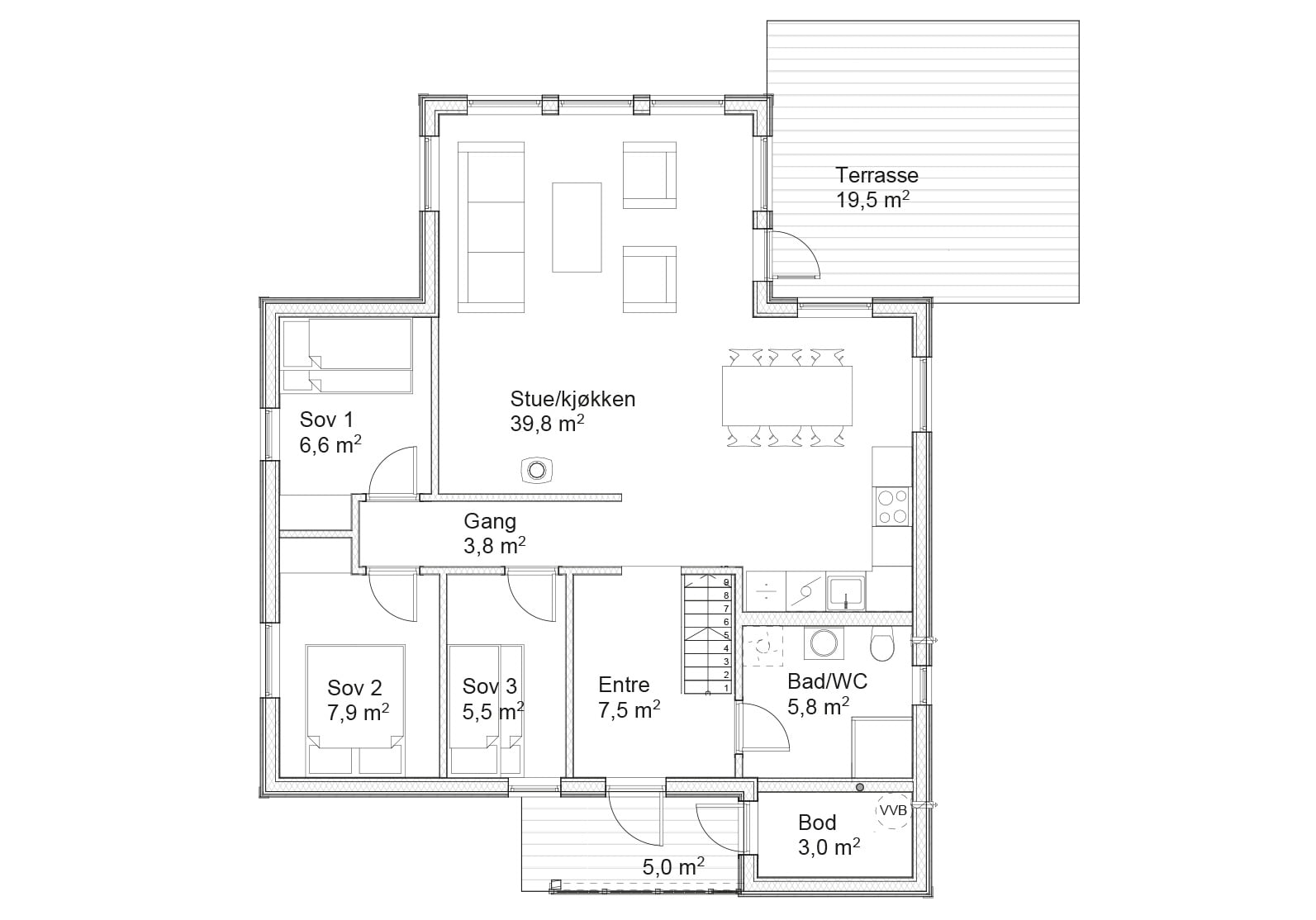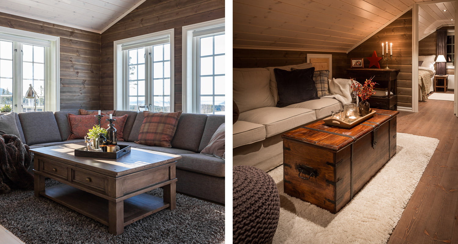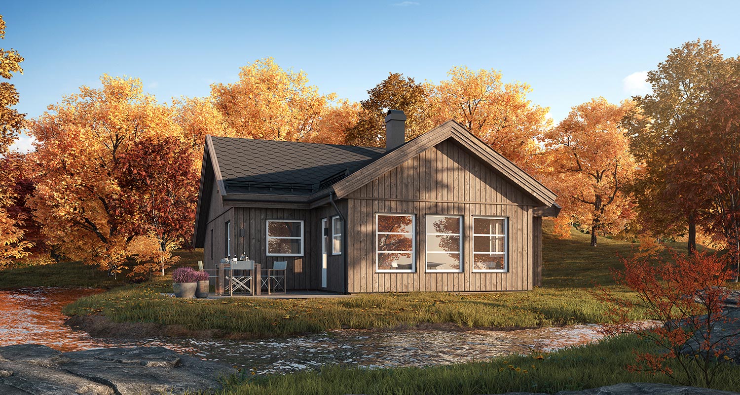 Med stue og kjøkken på nesten 44 kvm og 5 soverom får du mye plass i denne hytta. Vinkelutbygget i front gir rikelig med naturlig lys.